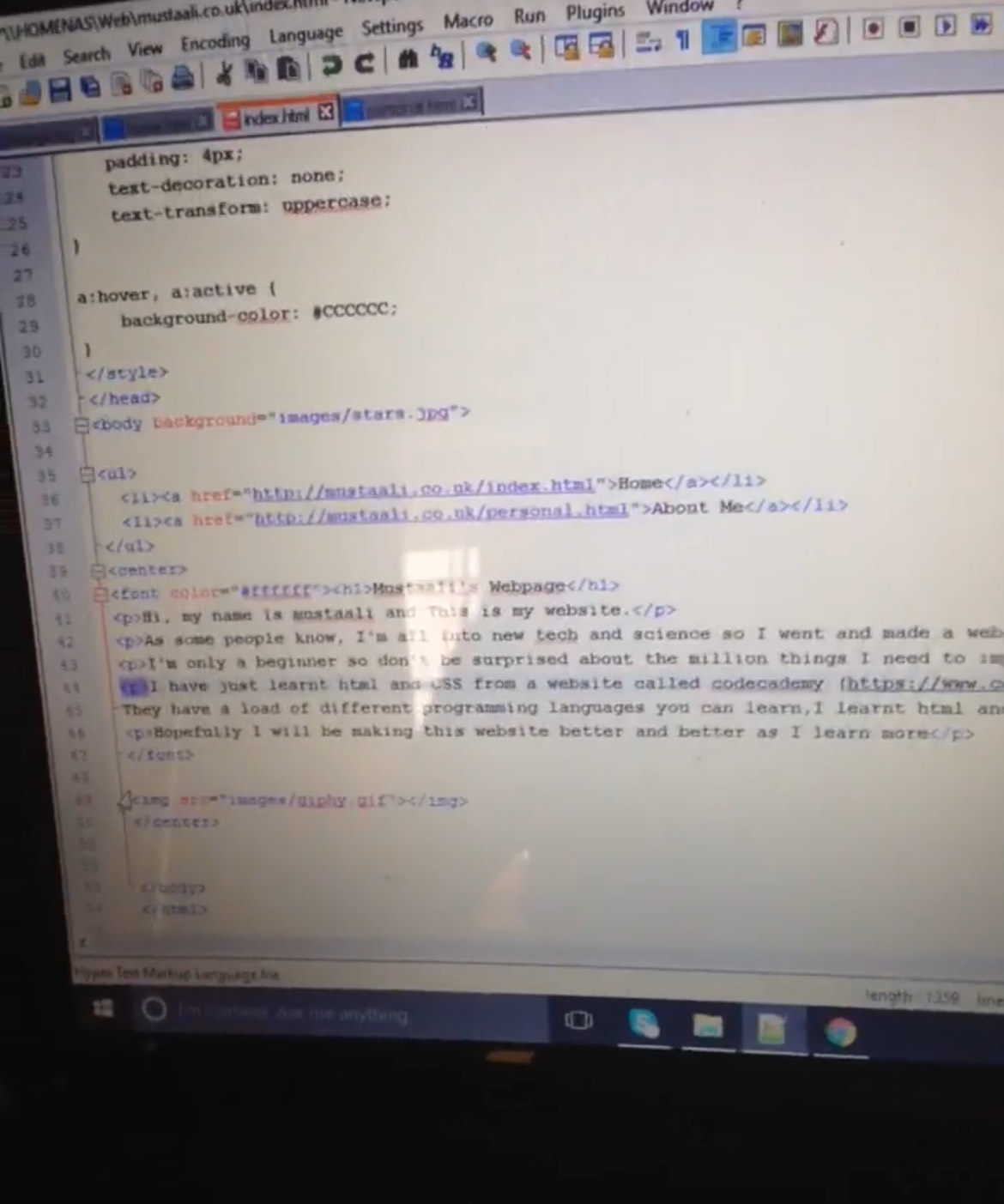 I made a simple website using HTML and CSS in Notepad after completing a course on Codecademy. I bought the domain mustaali.co.uk and updated it frequently, using it to display my interests and hobbies at the time. I also presented my website to my class in primary school. Now I have refactored it and used more complex web technologies like PHP and JavaScript for my portfolio. (Picture was taken 1 August 2016).