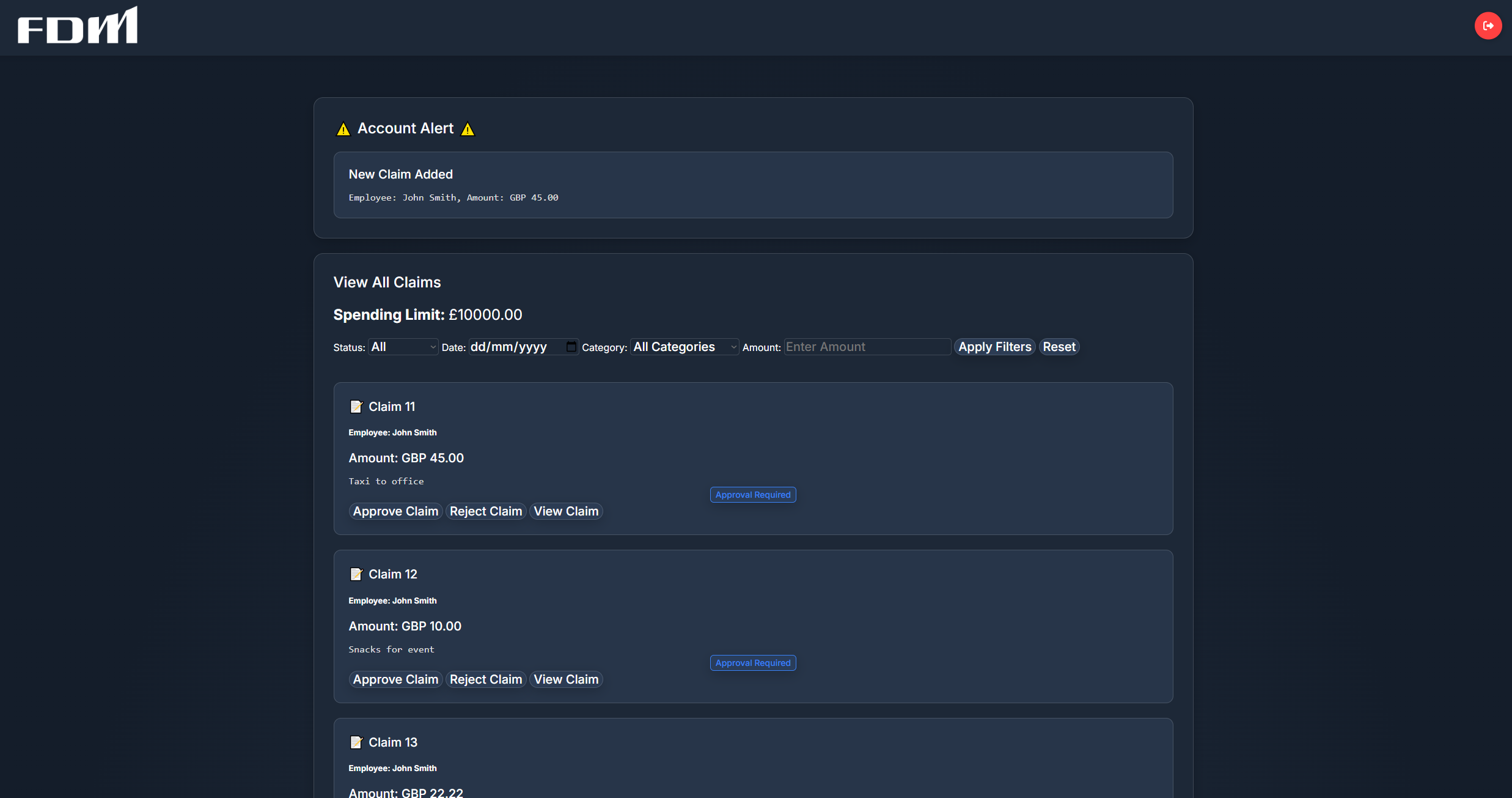 As part of a university software engineering project, I was part of a 7-person Agile team to develop a full-stack PHP-based expense management system for FDM Group. The system allows employees to submit expense claims, upload evidence, and track approval status, while managers and finance teams can review, approve, and process reimbursements.
