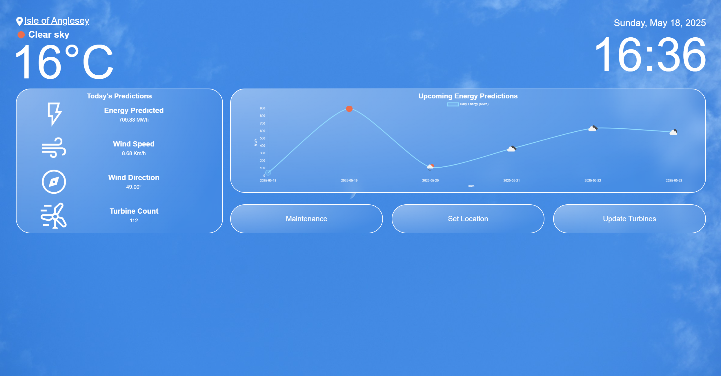 A key feature is the smart maintenance suggestion tool, which uses wind speed predictions and turbine specifications to recommend the best days for maintenance to reduce potential energy losses. This project was part of the Graphical User Interfaces module.