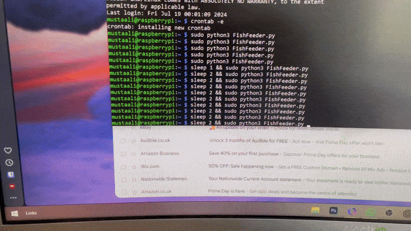 The feeder uses Python to turn the servo, which turns a drum of fish food. Since it was running on the Pi, I used the crontab to schedule it once per day. The code logs each time it turns the servo into a text file, and emails me too.